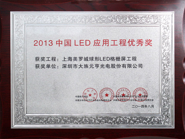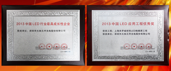 元亨光电(股票代码:430382)作为一家专业的高端LED显示屏和LED照明产品及工程系统解决方案提供商,在此次评选活动中以“上海美罗城球形LED格栅屏工程”成功摘得“2013中国LED应用工程优秀奖”奖项;并被评选为“2013中国LED行业最具成长性企业”。