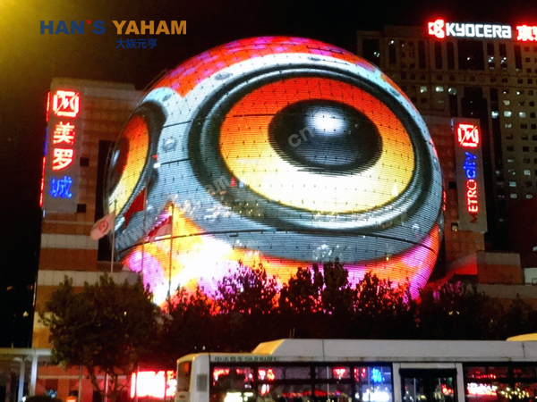 上海美罗城项目为世界首例大型玻璃球形建筑内安装广告光栅屏,整个建筑高达40多米,所有灯条13000根全部现场根据结构来组装,显示面积达2700平方米。