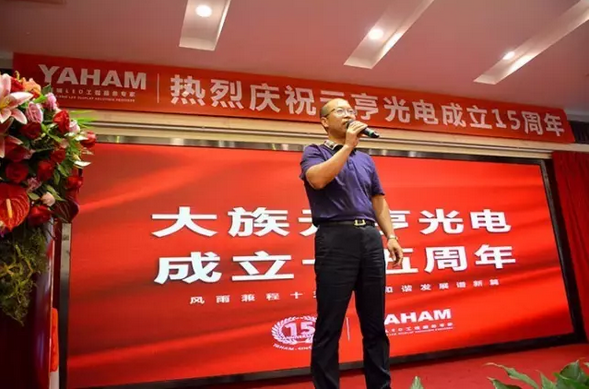 公司总裁王占明致辞,王总以时间为线索、以故事的形式生动形象地讲述了15年来元亨光电的成长之路,精彩纷呈,如临其境。