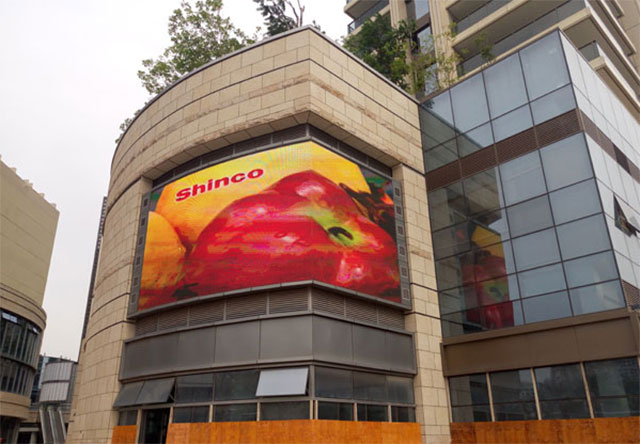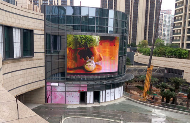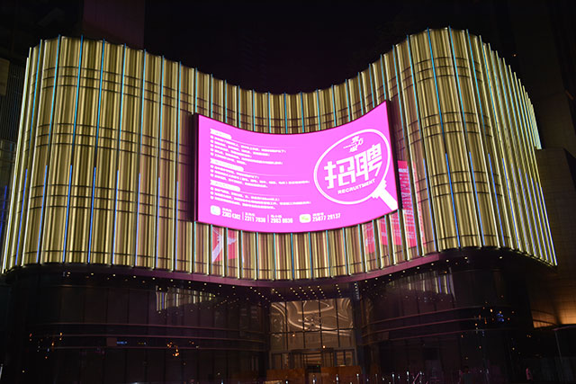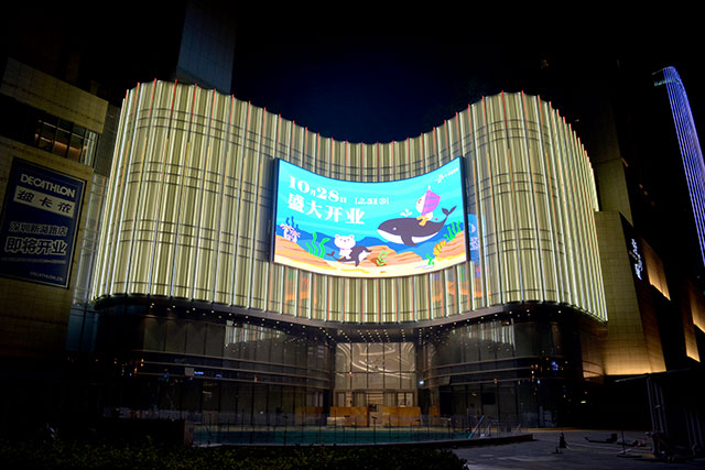 上图为外弧屏,屏体总面积209平方米,依据建筑的弧度,内嵌于建筑,确保最佳的视觉角度。