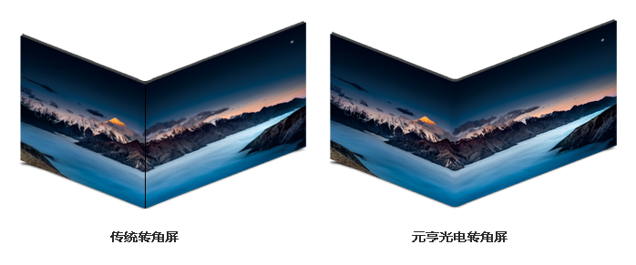 在2012年元亨光电无缝转角屏技术研发成功之前,行业内采用的转角做法通常有两种:1.LED屏箱体与箱体之间直接拼接,这种方法箱体拼接处存在着明显的缝隙,严重影响画面整体效果,破坏显示画面的立体感;2.采用弧形屏技术,建筑物自上而下为直线条造型设计,此类方法LED屏位置产生弧线造型,转角部位无法与建筑物贴合,破坏建筑整体装饰效果。元亨光电无缝转角屏技术克服了以上两种方法的缺陷,为转角建筑提供了一个更加完善的多面LED屏解决方案。至今为止,元亨光电已经打造了20多项高品质大型转角屏案例,深受客户和广告商的好评。