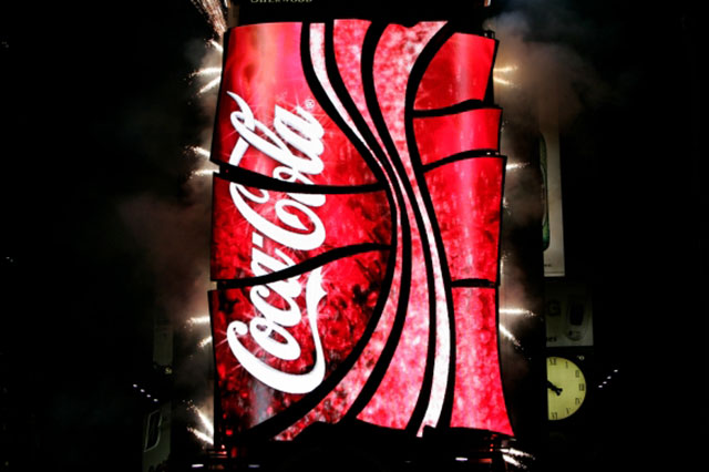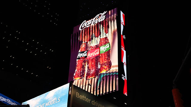时代广场是标志性的美国地标和户外广告的中心,素有世界的十字路口之称,每天约有30万人从这里经过,在这众屏云集的地方,可口可乐标志屏以其专有3D技术成功区别于其他显示屏,它为纽约市的上班族和游客这两类主要的受众量身定制节目,每周七天,每天24小时运转,广泛宣传各种产品,包括可口可乐,可口可乐零糖,健怡可乐和可口可乐生活。24小时的播放列表包括来自世界各地的可口可乐广告,并根据一天中的某个时间或一周中的某一天刷新广告素材。例如,路人可能会在午餐前看到一则广告,重点关注可口可乐配对的餐饮,以此触动受众,极大提高了品牌与受众参与性和互动性,把品牌带进生活。