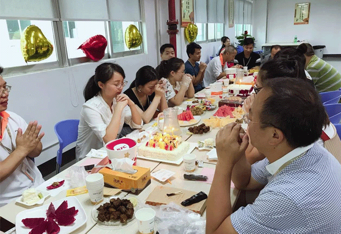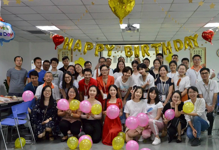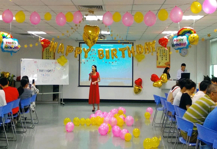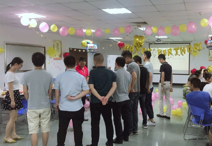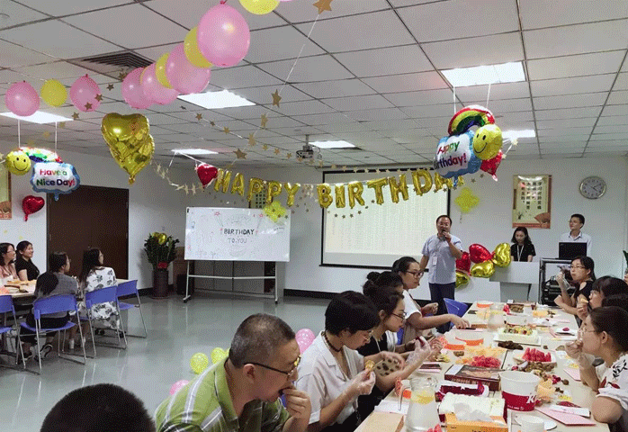 在人力资源部的精心策划和准备下,7月31日下午,元亨光电第三期生日会款款而至,现场彩色气球和五彩斑斓的装饰物为生日会增添了浓厚的节日色彩,寿星们都早早地来到会场,主持人为每一位寿星送上由公司总裁王总亲笔签名的生日贺卡,常务副总裁焦总还亲临现场为寿星们送上生日祝福。