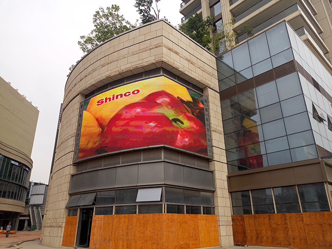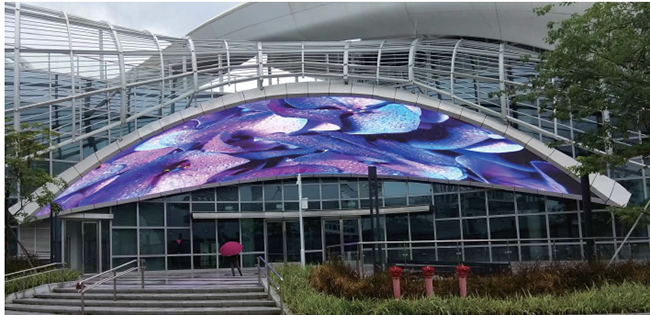 在广州安华汇,两块转角显示屏分别位于安华汇主建筑的南侧和北侧,显示面积分别为344㎡和402㎡,使用元亨光电专项研发无缝转角LED屏技术,实现两块屏90°和107°的完美转角,受众覆盖主建筑南、西、北三个面。在确保播放内容连续性、立体感的同时,不失与建筑物造型线条的贴合性和协调性。
