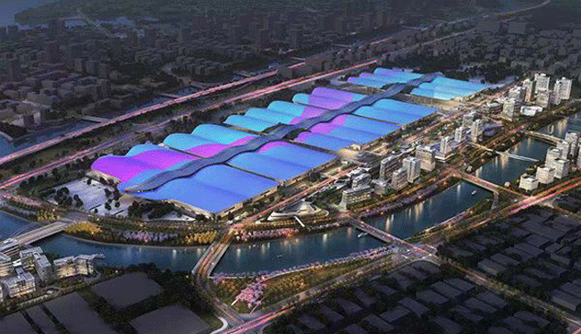 这座有八项“世界之最”加身的深圳国际会展中心由16个2万平米标准展厅、1个5万平米超大展厅、2个2万平米多功能展厅、2个登录大厅和1个接待大厅组成,集展览、会议、活动、餐饮、购物、办公服务于一体。160万平米的总建筑面积,相当于6座“鸟巢”。寓意“海上丝绸之路”的彩色丝带花纹屋面,面积可覆盖106个标准足球场,站在屋面,放眼望去,屋面如起伏的波浪,中轴走廊屋面如同一条巨龙出海般向南北延伸。