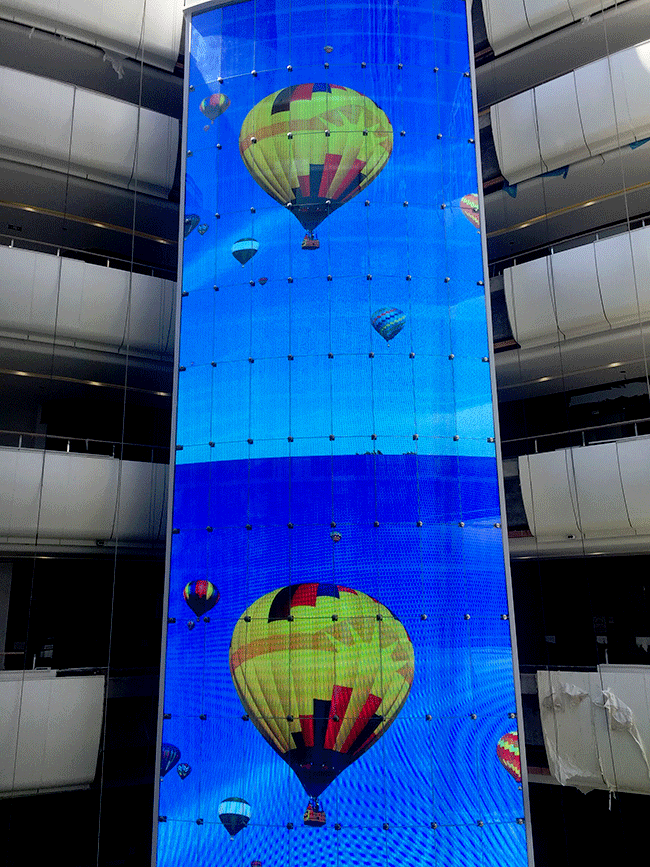 这块横贯整个观光电梯玻璃幕墙的透明屏,由元亨光电P10侧发光透明屏打造而成。由于观光电梯内部结构比普通建筑的玻璃幕墙复杂,在产品设计时,工程师便严格按照电梯内结构规划设计,分割模数与幕墙一致,并且保持外观颜色与幕墙一致,使屏体与电梯整体和谐不突兀。