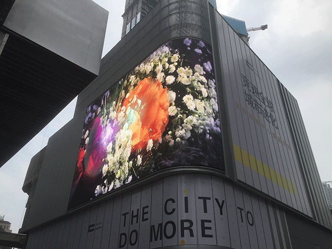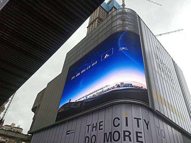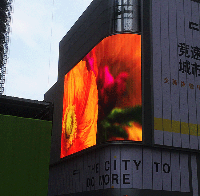 这块巨型户外显示屏由元亨光电S系列产品打造而成,平面加弧面的设计,弧面采用元亨光电独创专利无缝转角过渡技术,使显示屏完全贴合各种建筑角度,同时兼顾转角处平滑无缝过渡,消除传统拼接转角出现的拼缝问题,完美呈现整屏立体式效果。