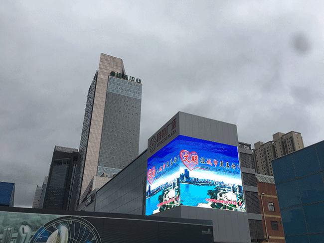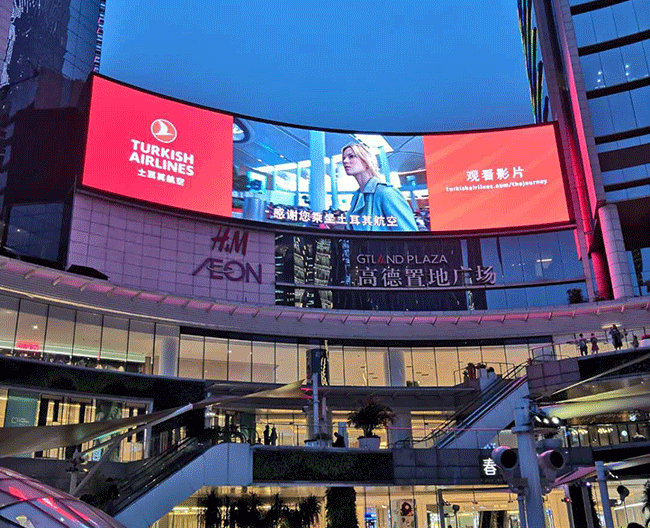 在合肥国购广场,元亨光电为其打造的DT16户外全彩屏,以402.44平米的面积雄踞在国购广场上,完美的转角过渡,最大化的有效视角,转角处独特的三重帽檐设计,提升产品对比度,远远望去,就像一幅巨型画卷。