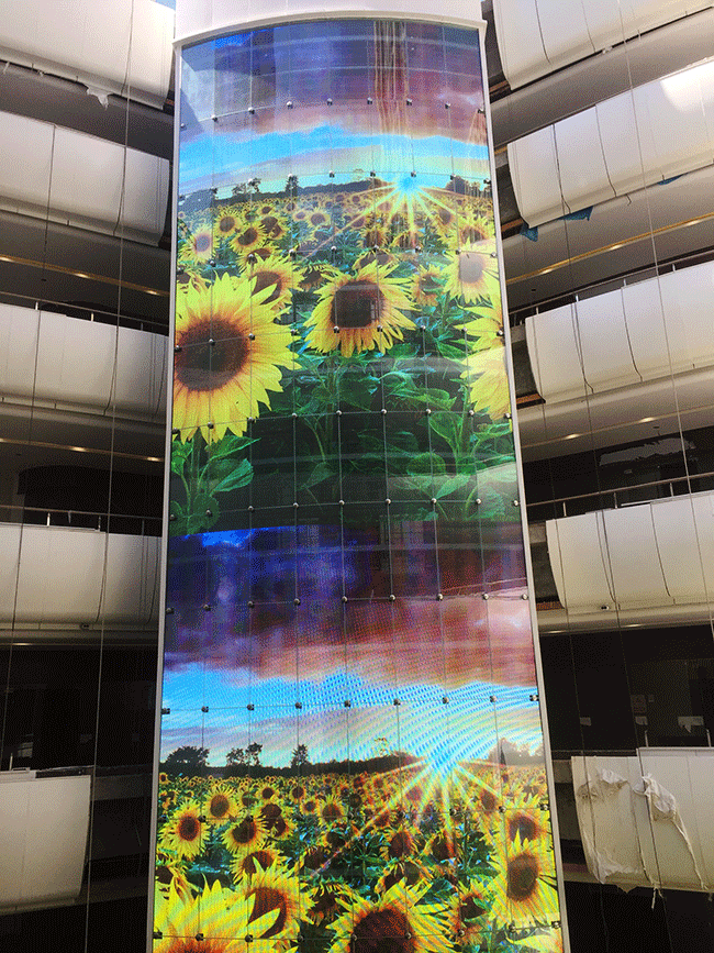 除了元亨户外产品,元亨透明屏明星产品也在合肥绽放异彩。禹洲天河茂,这座享有“生态水游城”美誉的生态空间里,元亨光电为其打造的曲面LED透明屏中通整个观光电梯玻璃幕墙,屏体按照电梯内结构规划设计,分割模数与幕墙一致,并且保持外观颜色与幕墙一致,使屏体与电梯整体和谐不突兀。