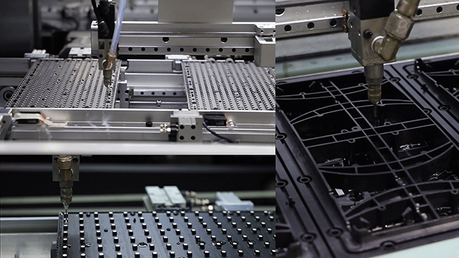 引进全自动底壳装配线实现全自动喷涂、螺丝锁紧、点胶等功能,喷涂机采用双头喷涂模式,提升效率。全自动底壳装配线引进后,工作效率由人均300/11提升至100/1,由人工搬运导致的产品损坏率减少,设定程序批量操作大幅度提升了产品合格率。