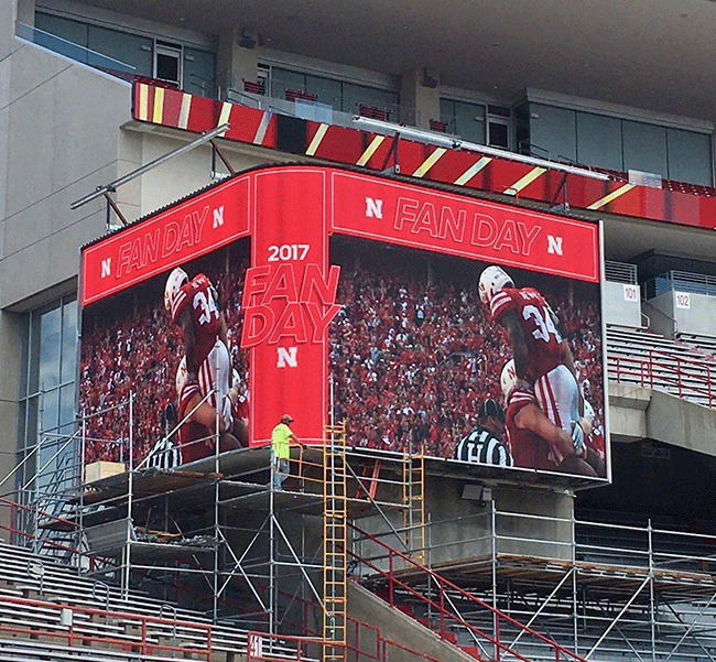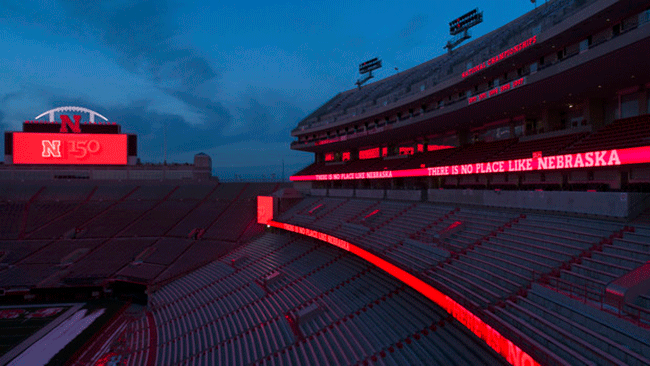 内布拉斯加大学剥玉米人队(Nebraska Cornhuskers)的主场是内布拉斯加大学纪念体育场,该体育场用以参加NCAA橄榄球赛事。由于球迷们在比赛日都会身着红色的球衣,所以该球场也被昵称为“红色的海洋”。对狂热的球迷来说,谈论一个新球场就像是捅了马蜂窝一样热闹。体育场修建至今,经历了多次翻修,最近一次翻修,内布拉斯加大学下重本更换了场内所有LED显示屏,让观众感受最佳观赛体验。