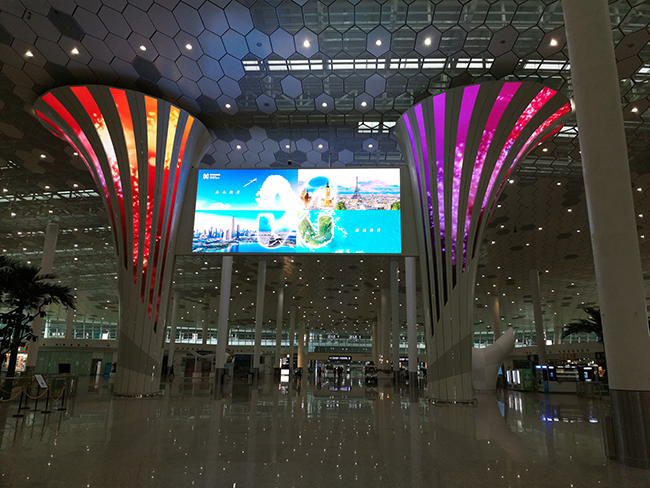 深圳机场“未来树窗”项目,异形屏体镶嵌在呈放射状的钢结构树干中,独出机杼的树干设计与机场灵动飞扬而又磅礴大气的建筑风格巧妙融合,搭配有规律自动升降的大屏,充分体现深圳这个创客之都的科技魅力与时尚气息。